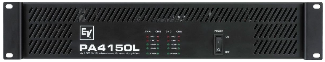 The Electro-Voice PA4150L is a professional 4-channel Class AB power amplifier designed for high-quality, reliable performance in fixed installations. It delivers 160 watts per channel at 4 ohms, making it ideal for multi-zone commercial sound systems and applications requiring clean audio across multiple outputs.